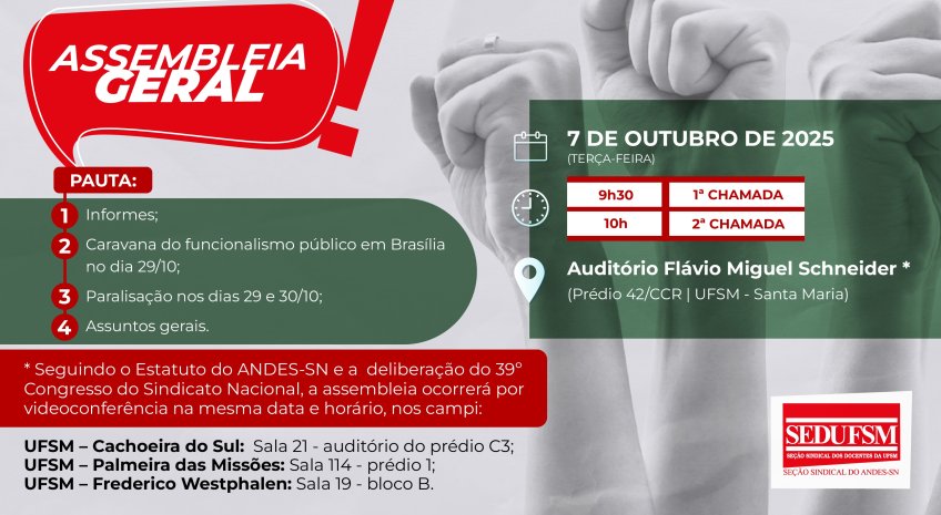 Encontro convocado pela Sedufsm tem início às 9h30, em primeira chamada, ocorrendo nos quatro campi da universidade