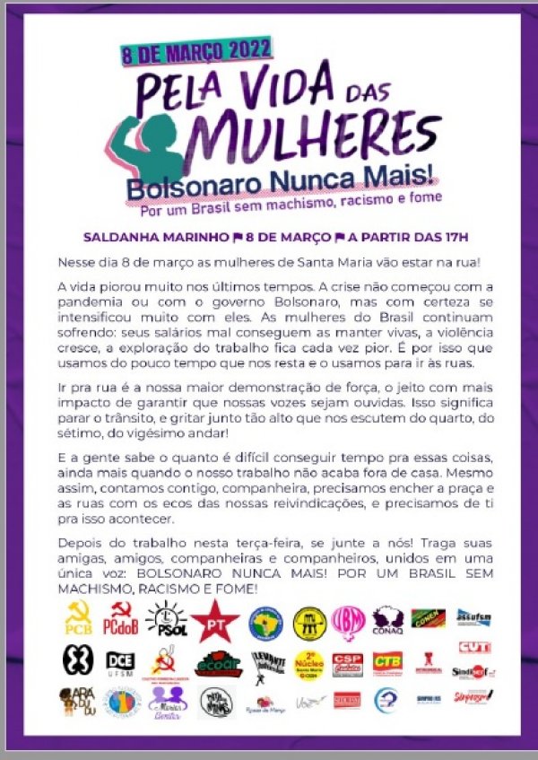 A próxima terça, 8 de março, Dia Internacional da Mulher, será marcada por um ato público na praça Saldanha Marinho a partir das 17h. O evento, intitulado “Pela vida das mulheres”, é organizado por mais de duas dezenas de entidades, entre elas, a Sedufsm. Durante a manifestação haverá também a distribuição de panfletos, através dos quais é destacada a luta histórica das mulheres, trazendo para o contexto atual, que é o combate ao machismo, racismo, à fome, e pelo “Fora Bolsonaro”.