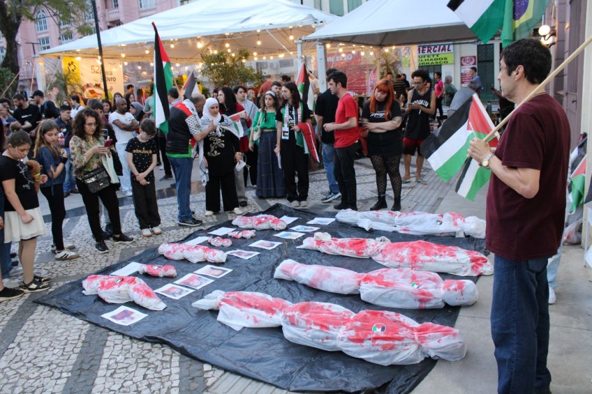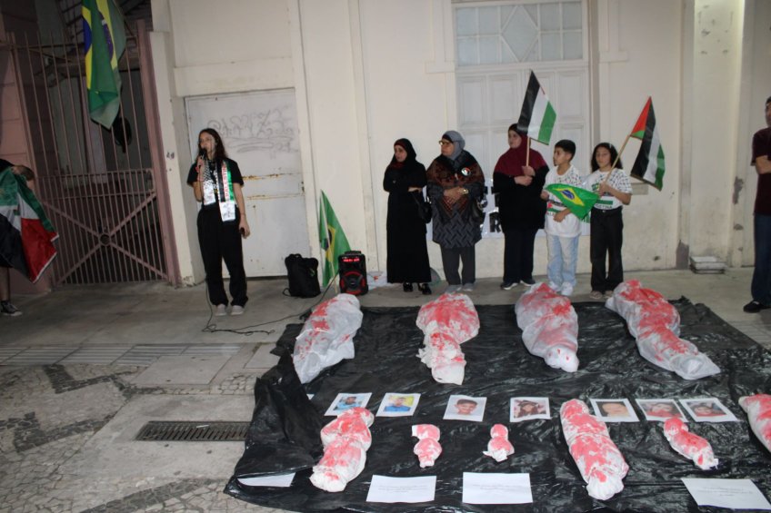 Durante o protesto, as e os manifestantes montaram algumas réplicas de pessoas mortas, envoltas em panos com manchas vermelhas que simbolizavam o sangue derramado das milhares de vítimas somadas que foram contabilizadas ao longo de quase dois anos de ataques das forças de segurança israelenses.