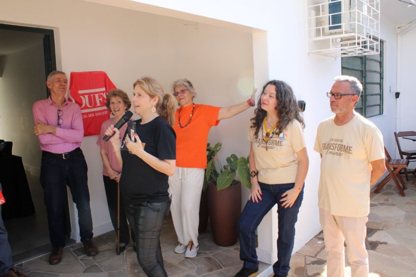 Liane Weber, que acompanhou desde a aquisição da Casa até todas as obras feitas para que o espaço fosse entregue à categoria, ressaltou que a sede da Rua André Marques foi um momento muito feliz da luta docente e seguirá sendo especial, mas que, com a mudança de toda a UFSM para Camobi, o sindicato acabou ficando distante das e dos docentes, de modo que se tornou ainda mais importante a aquisição de uma nova sede. “Não foi nem um pouco fácil, tínhamos muitos medos, não sabíamos se daríamos conta. Mas nunca tivemos dúvida sobre esse ser o lugar certo para nós, um lugar onde poderíamos vir a pé da Universidade, um lugar que agora comporta uma linda biblioteca, um lugar que honra a memória do que já foi construído para que tenhamos os alicerces e sigamos em frente”, destacou a dirigente, agradecendo à gestão anterior, Renova Sedufsm (biênio 2022-2024), por ter a “audácia” necessária para dar um passo à frente e adquirir o espaço.