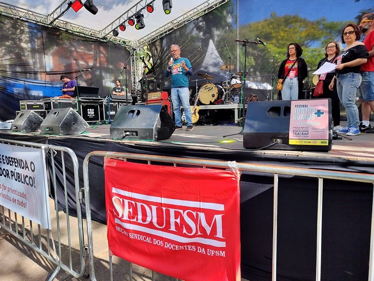 Procurando sair dos formatos tradicionais, a Sedufsm também esteve presente, no sábado, 18 de outubro, do Festival “Juntos Somos Mais”, em parceria com o sindicato de professores municipais (Sinprosm) e o 2º Núcleo do Centro de Professores Estaduais (Cpers), que ocorreu no Parque Itaimbé, região próxima ao centro de Santa Maria. Durante a programação ocorreram shows de bandas locais de diferentes estilos, além de praça de alimentação, feira de brechós e artesanato, espaço kids e variadas atividades culturais.