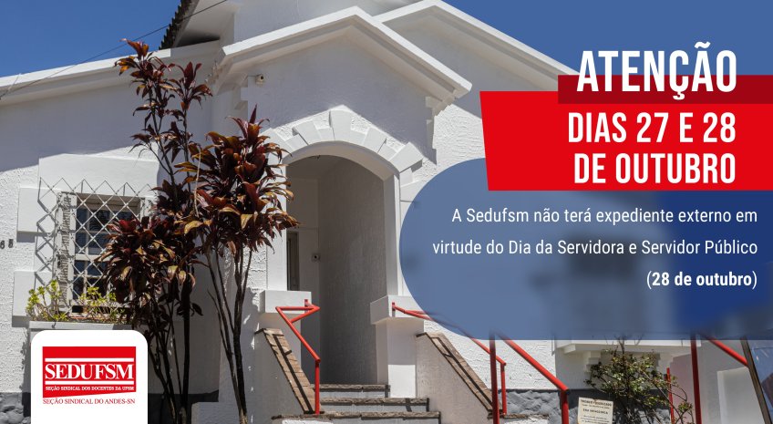 Na próxima segunda-feira, 27 de outubro, e na terça, 28, a Sedufsm não terá expediente em nenhuma de suas sedes (Centro e Camobi), em virtude do Dia da Servidora e do Servidor Público, comemorado na terça, 28.