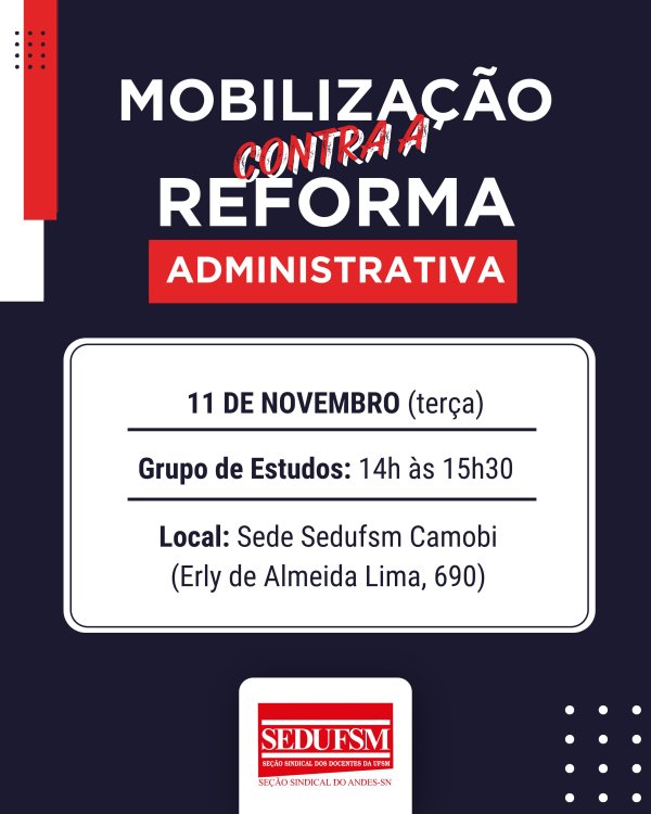 A criação do grupo de estudos sobre a Reforma Administrativa foi uma sugestão vinda da assembleia docente ocorrida nesta segunda, 3 de novembro, tendo sido reforçada na reunião de avaliação ocorrida na quinta, 6. Ao longo das duas últimas semanas, a diretoria percorreu unidades de ensino da UFSM dialogando com a categoria a respeito dos ataques contidos na reforma, que penaliza servidores e população, atacando direitos e sucateando serviços públicos.