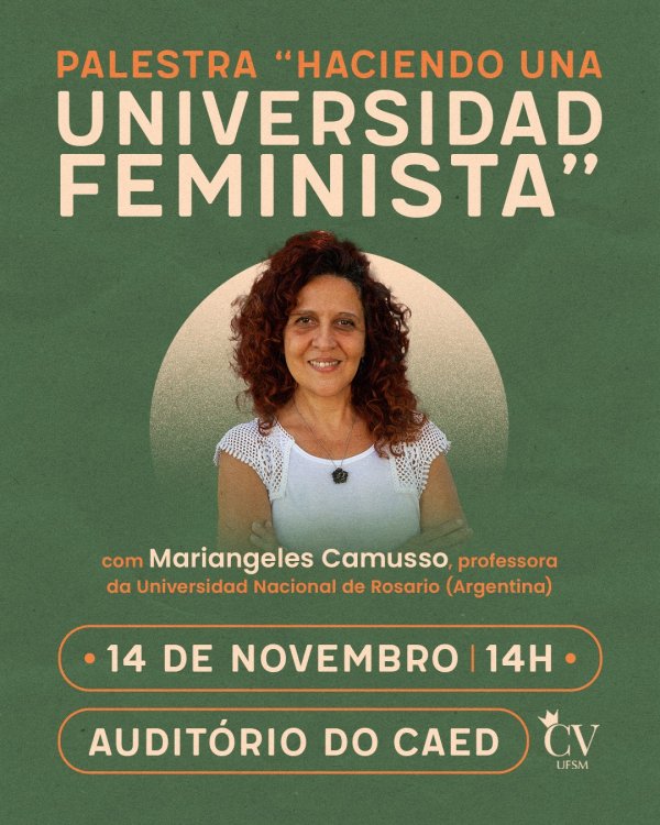 Nesta sexta-feira (14), às 14h, no auditório do CAED (prédio 67), o Comitê de Igualdade de Gênero (CIG) da UFSM promove a palestra “Haciendo una Universidad Feminista”, com Mariangeles Camusso, professora da Universidad Nacional de Rosario (UNR), Argentina.