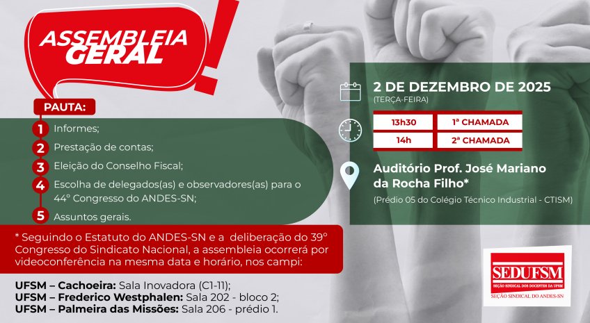 Na próxima terça-feira, 2 de dezembro, as e os docentes da UFSM reúnem-se em assembleia no Auditório Professor José Mariano da Rocha Filho, localizado no CTISM, a partir das 13h30 em primeira chamada, e das 14h em segunda chamada. No encontro, serão debatidos os seguintes pontos de pauta: