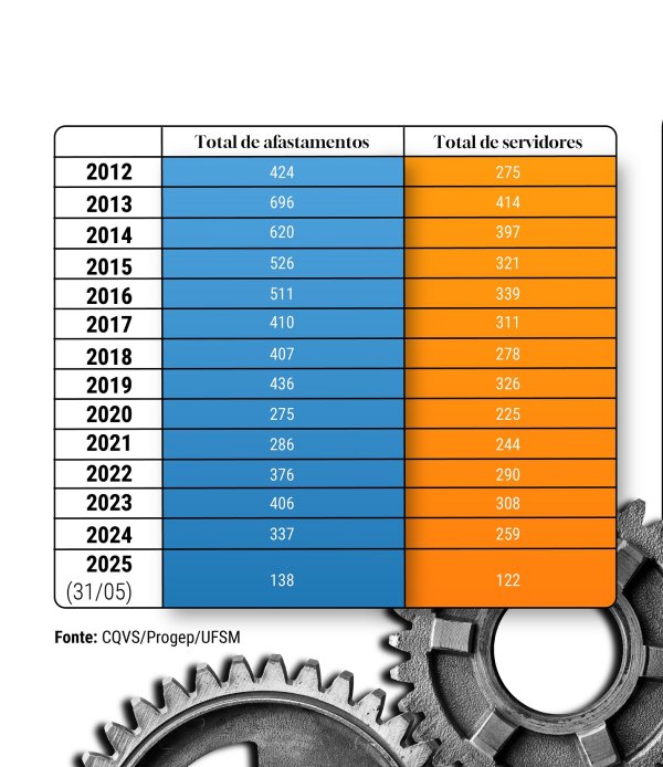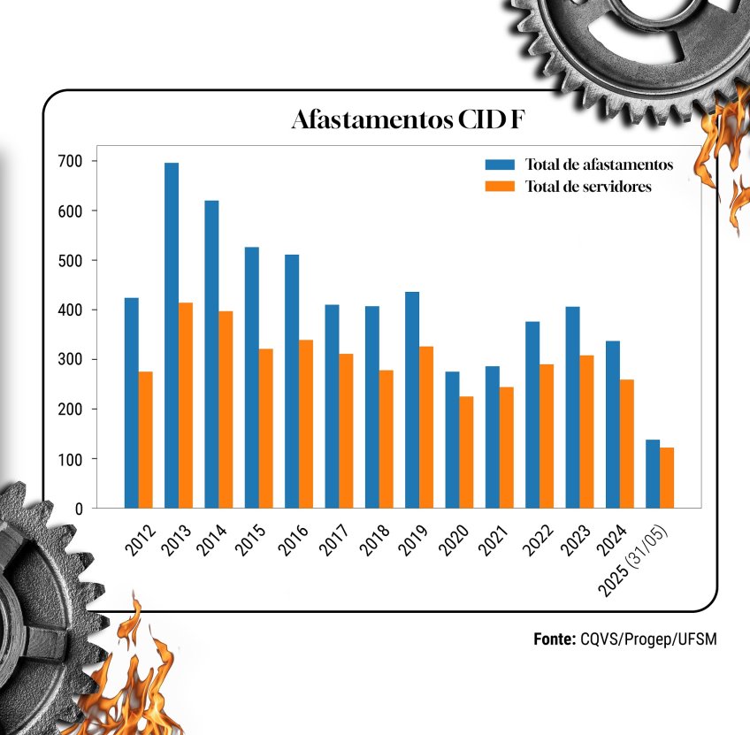 Acompanhe a seguir tabelas comparativas que trazem o número total de afastamentos por ‘CID F’, que corresponde a transtornos mentais e comportamentais. Os números levantados pela CQVS são a partir de 2012 até maio de 2025 e incluem docentes e técnicos, pois a CQVS não conseguiu fazer a separação antes do prazo de publicação.