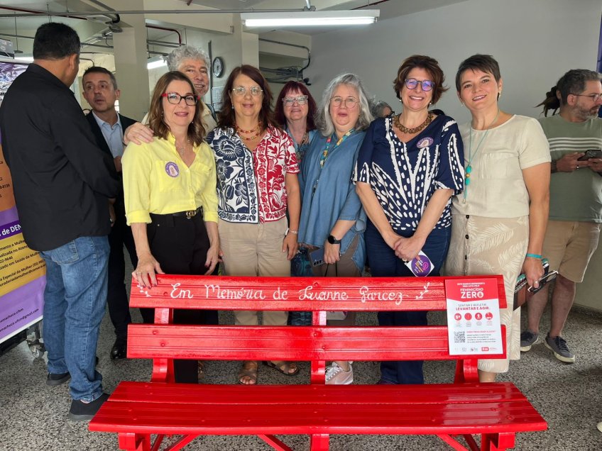 Inauguração do Banco Vermelho no CE – Na tarde desta segunda-feira, 9 de março, a diretora Belkis Bandeira, que é docente do Centro de Educação (CE), acompanhou a inauguração, no hall do prédio 16, do Banco Vermelho. Símbolo de combate ao feminicídio e à violência contra a mulher, o Banco foi uma homenagem, também, à estudante de Pedagogia da UFSM Luanne Garcez da Silva, vítima de feminicídio em 2023. Familiares de Luanna estiveram presentes na solenidade de inauguração,