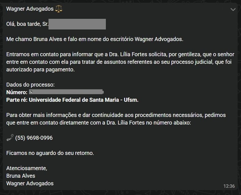 Após o primeiro contato, os criminosos passam a interagir já de posse de informações pessoais da possível vítima, como nome completo, CPF e número de processo. Nas mensagens mais recentes, se utilizam de nomes de advogadas e advogados solicitando contato via número de telefone. Em seguida, solicitam dados bancários e exigem depósitos ou transferências via Pix, sob o pretexto de “liberação de valores judiciais”.