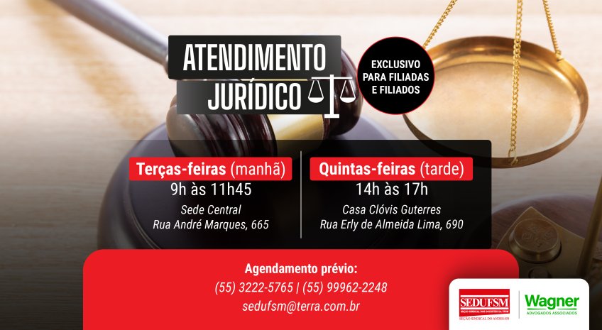 A Sedufsm informa aos seus sindicalizados e sindicalizadas que oferece plantões semanais da assessoria jurídica em ambos os endereços do sindicato, no Centro e em Camobi. Os atendimentos são realizados presencialmente, com possibilidade de ocorrer também por telefone ou de forma online, conforme a demanda, sempre mediante agendamento prévio.