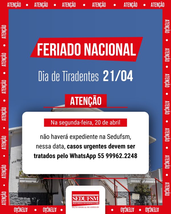 Sedufsm tem feriado estendido na próxima segunda e terça, 20 e 21 de abril