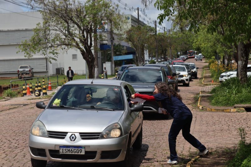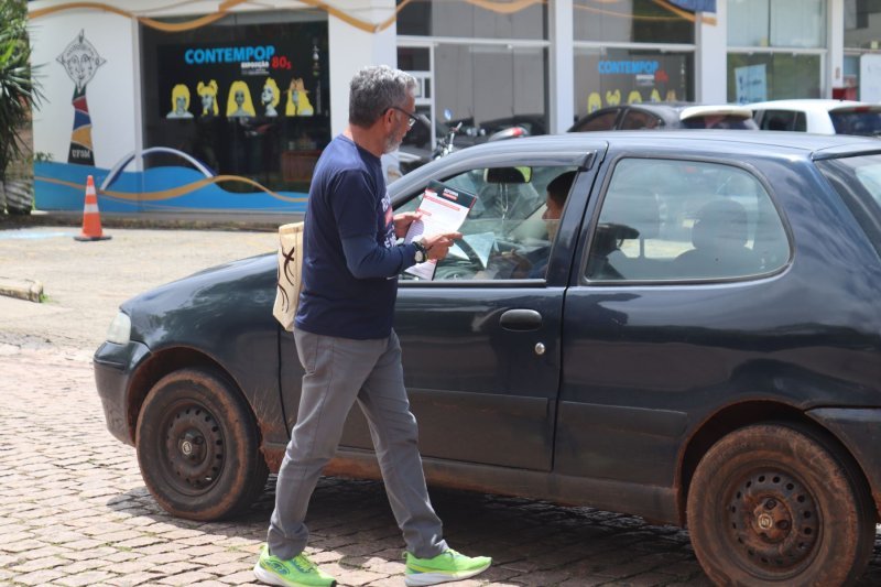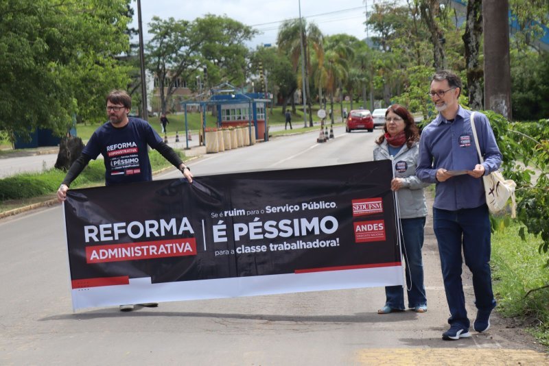 Na quinta, 30 de outubro, dentro da agenda de mobilização contra a PEC 38/25, da Reforma Administrativa, docentes realizaram uma panfletagem junto ao arco de entrada do campus sede da UFSM, em Camobi.