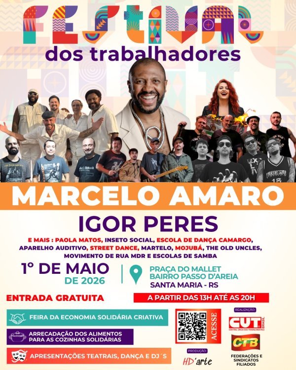 Programação gratuita reúne atrações locais e regionais no dia 1º de maio, na Praça do Mallet, a partir das 13h; Sedufsm integra organização e participação