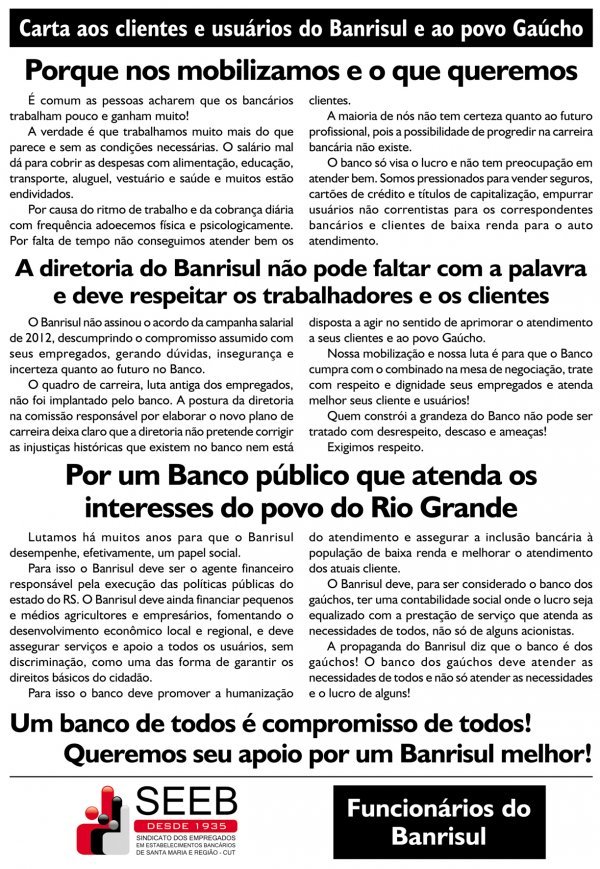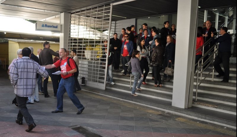 Na manhã desta terça-feira, 7 de maio, os servidores do Banco do Estado do Rio Grande do Sul (Banrisul) atrasaram em duas horas o horário de abertura das agências. O motivo desta paralisação é mais uma ação para demonstrar a insatisfação dos bancários com o Plano de Carreira que foi apresentado no dia 16 de abril de 2013, e que na visão do sindicato da categoria, impõe medidas abusivas aos trabalhadores. A Sedufsm, de antemão, repudia a postura da direção do banco, que é estatal, vinculado ao governo do estado, e que, por isso, deveria ter uma postura menos exploradora, enfatiza o professor Rondon de Castro.