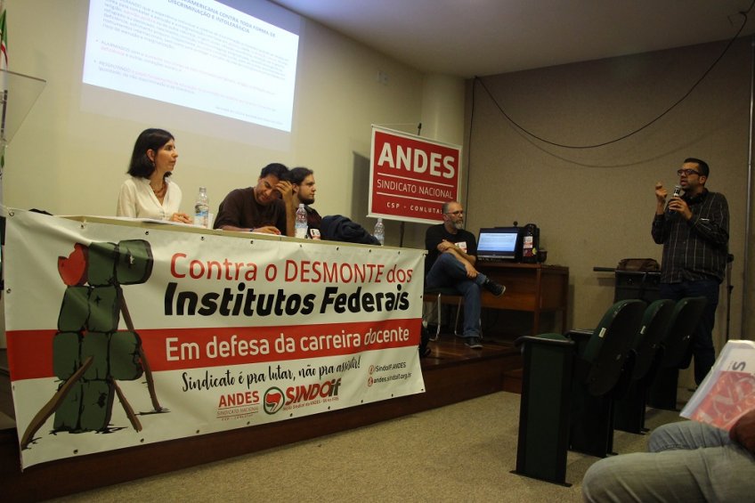 Para além do debate sobre paridade de gênero no ANDES-SN, o XIX Encontro da Regional RS também contou com outras duas atividades. Na abertura do evento, na sexta-feira, 14, a mesa “Os ataques financeiros e ideológicos contra a educação pública”, promoveu um importante debate sobre o duro período recente, com enfoque especial aos cortes orçamentários e à projetos como o “Escola Sem Partido”. Na mesa, falando especificamente sobre o contexto financeiro da educação pública, o 1º vice-presidente da Regional Nordeste I do ANDES-SN, Osmar Gomes de Alencar Júnior, fez um apanhado da mais recente crise econômica global, passando pelas opções políticas dos últimos governos brasileiros perante esse cenário (como a manutenção do pagamento da dívida e a transferência de recursos públicos para o setor privado) e chegando até os impactos atuais em setores como a saúde e a educação. Para Osmar, uma das expressões máximas desse momento é a edição da Emenda Constitucional 55, conhecida como a “PEC do teto de gastos”. Com a emenda, tratando-se da educação, o governo coloca em curso medidas “necessárias” ao cenário de restrição orçamentária, como, por exemplo, a desestruturação da carreira, o contingenciamento de verbas – o que obriga a negociação de verbas através de emendas parlamentares –, os cortes em bolsas, a ampliação do setor privado dentro das instituições e a aprovação do marco de ciência e tecnologia – que também atua no sentido de ampliar a presença do setor privado nas instituições públicas.
