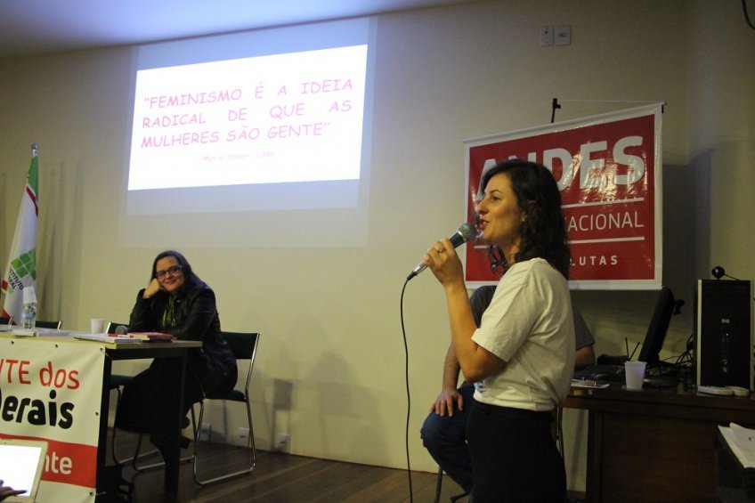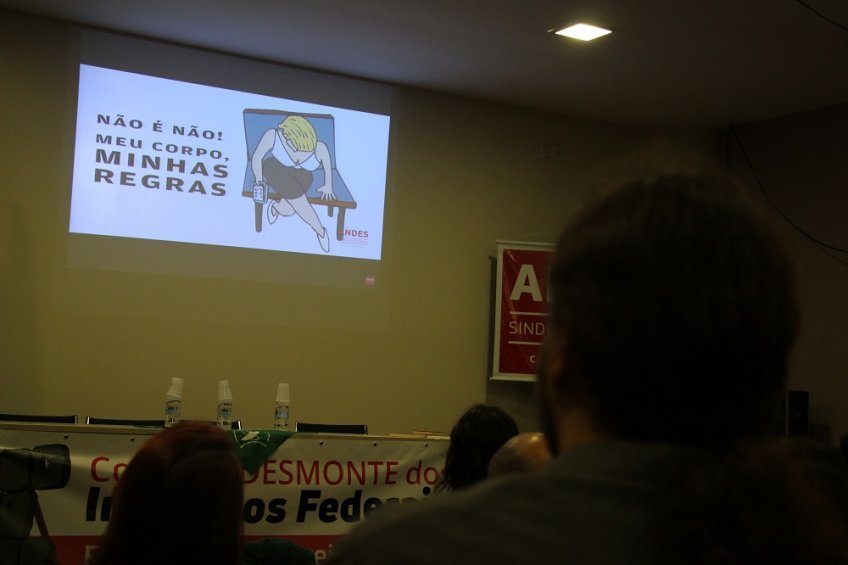 Dando sequência ao debate, a vice-presidenta do SindoIF, Andréia Meinerz, e a secretária geral também do SindoIF, Manuela Finokiet, destacaram um pouco da experiência de construção da luta das mulheres, dentro da mais jovem seção sindical do ANDES-SN. Ali, segundo relataram, a organização da pauta de gênero teve como ponto fundante um caso de assédio contra uma docente – cujo agressor é também um docente – a partir do qual foi criado o “Grupo de Trabalho (GT) de Mulheres”. Com a constituição do GT, uma roda de conversa de mulheres foi realizada no campus de Osório e mais e mais relatos de violência foram trazidos. Disso, um texto intitulado “Manifesto (em construção) de Mulheres do Ifrs - Carta De Osório” foi construído, divulgado e entregue à reitoria. “O assédio contra a mulher é algo tão corriqueiro, tão sistemático, está acontecendo tanto, e ao mesmo tempo a gente não tem mecanismos de constranger, educar e, eu acho, de punir”, destacou Manuela. Além disso, a secretária geral discorreu também sobre diferentes níveis nos quais pode se manifestar o machismo. Para ilustrar esse raciocínio a docente exibiu no telão uma imagem da posse de Michel Temer, após o golpe de 2016. Na foto, Temer é cercado exclusivamente por homens. Na sequência, traçando um paralelo com a foto, Manuela expôs a programação de um evento acadêmico no qual das 11 atividades realizadas, entre mesas, palestras e mini-cursos, constava apenas o nome de uma mulher como responsável por um mini-curso. “E a resposta foi: ‘ah, vamos fazer um evento sobre diversidade e a gente coloca todo mundo lá”, afirmou Manuela, que ainda complementou: “o nosso grande desafio é que isso não precise ser sempre sinalizado. Que isso esteja presente. Que em qualquer evento, mesa, espaço, em qualquer conselho, em qualquer comissão que vá se constituir, a gente pense em representatividade étnico-racial, porque ainda infelizmente não se consegue falar em paridade, e a gente pense em paridade de gênero. Porque a gente não sabe como atuar nesses espaços e ficamos muito impressionadas com o quanto vocês homens se sentem sempre muito à vontade para ocupar todos os espaços”, concluiu.