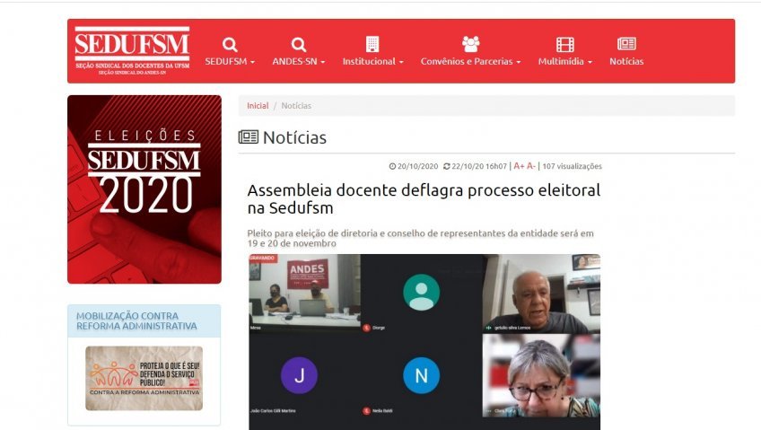 A Seção Sindical dos Docentes da UFSM (Sedufsm) criou um espaço específico em sua página na internet para divulgar notícias e documentos relacionados ao pleito da Sedufsm (que ocorre em 19 e 20 de novembro) e também ao do ANDES-SN (que acontece de 3 a 6 de novembro).