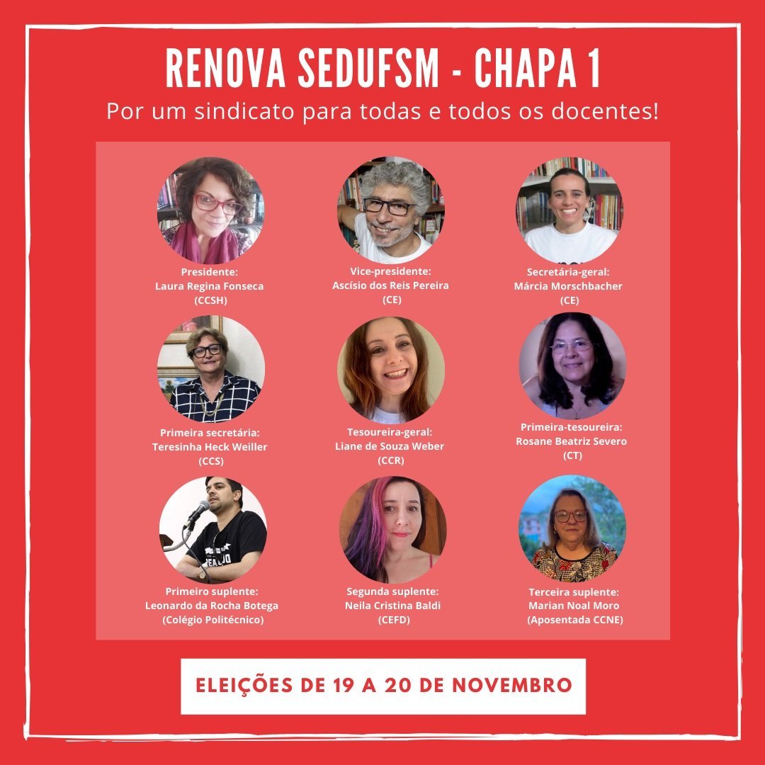 Nesta quarta, 18, a partir de definição da Comissão Eleitoral Local, estamos divulgando o segundo e último material da chapa 1 (Renova Sedufsm), única concorrente à direção da Sedufsm no pleito destes dias 19 e 20 de novembro. Na semana passada (quarta, 11), publicamos o primeiro material da chapa. Nesta sequência, os integrantes do 'Renova' se apresentam a sindicalizados e sindicalizadas e fazem uma síntese do que pensam para o futuro da seção sindical. Acompanhe a seguir.