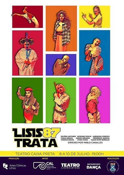 Neste final de semana (sábado e domingo, 8 e 9 de julho) e mais a segunda, 10 de julho, sempre às 19h, o Teatro Caixa Preta, na UFSM será palco da peça Lisístrata 87. Sob a direção do professor do departamento de Artes Cênicas da UFSM, Pablo Cannales, a peça é uma adaptação de “Lisístrata”, do grego Aristófanes. O Caixa Preta fica anexo ao prédio 40, do Centro de Artes e Letras (CAL). A entrada é franca, com as senhas podendo ser retiradas 30 minutos antes do início do espetáculo ou, para quem preferir, o ingresso pode ser adquirido através do www.sympla.com.br (site). A duração da peça é de 1h e 40min e a classificação indicativa é de 14 anos.