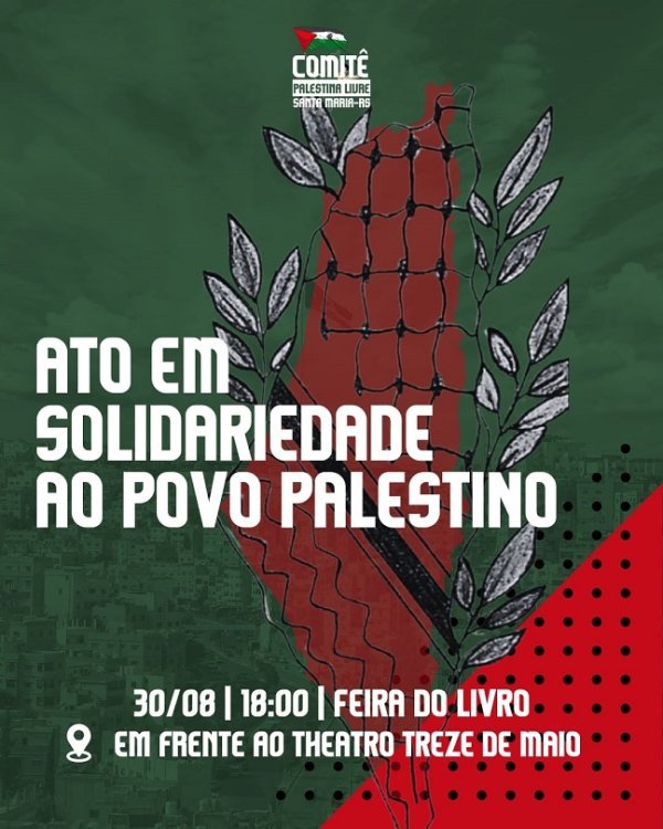 Neste sábado, 30 de agosto, os sindicatos e movimentos sociais que participam do Comitê Palestina Livre de Santa Maria realizam uma manifestação na praça Saldanha Marinho. O ato público em solidariedade ao povo palestino acontece a partir das 18h, em frente ao Theatro 13 de Maio.