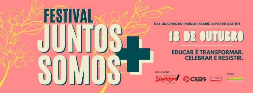 Neste sábado, 18 de outubro, os três sindicatos docentes: Sedufsm, Cpers e Sinprosm, promovem o “Juntossomos+” a partir das 15h, nas quadras do Parque Itaimbé. Segundo as instituições organizadoras, o festival nasce com a proposta de unir cultura, celebração e resistência. O objetivo principal é reafirmar a importância da valorização do serviço público e do trabalho coletivo. O festival pretende ser um espaço de encontro, integração e de reafirmação da luta das categorias por direitos e reconhecimento.