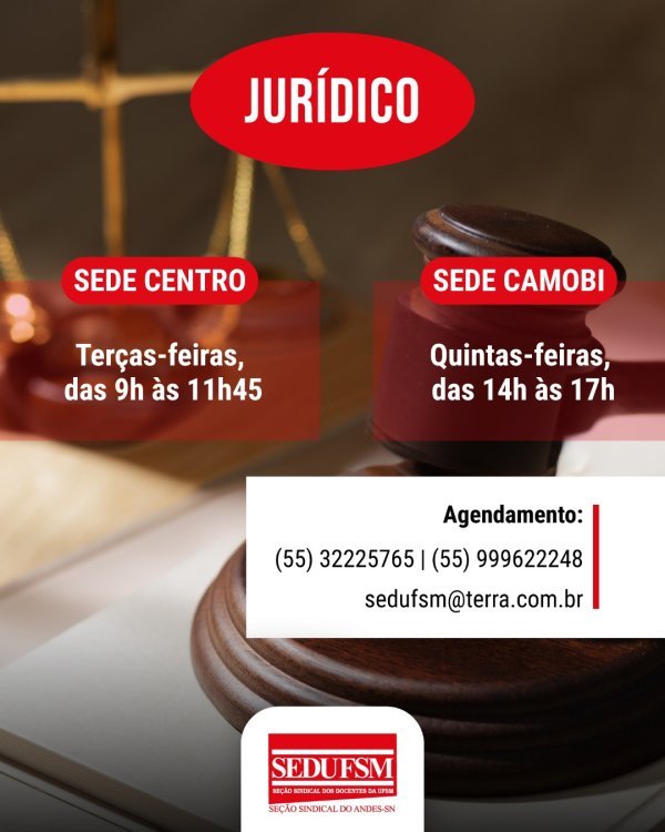 Em ambos os plantões – terças e quintas -, é necessário o agendamento prévio através do email sedufsm@terra.com.br ou pelos telefones (55) 32225765 | (55) 999622248.