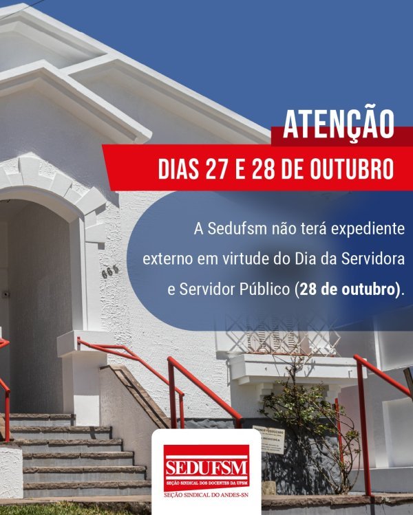 Na próxima segunda-feira, 27 de outubro, e na terça, 28, a Sedufsm não terá expediente em nenhuma de suas sedes (Centro e Camobi), em virtude do Dia da Servidora e do Servidor Público, comemorado na terça, 28.