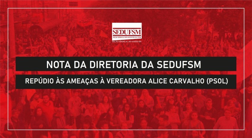 "A diretoria da Seção Sindical dos e das Docentes da UFSM (Sedufsm) vem a público repudiar as ameaças à vereadora Alice Carvalho (PSOL). Nos solidarizamos à parlamentar que vem sofrendo intimidações de caráter racista, misógino e machista com a intenção de silenciá-la. Nenhuma violência é tolerável e, quando endereçada a uma parlamentar, é um ataque também à democracia. Por isso, exigimos investigação e punição. Acreditamos que uma sociedade socialmente justa se faz com diferentes vozes, em pluralidade de ideias. E que o debate se faz necessário sempre, sem violências.
