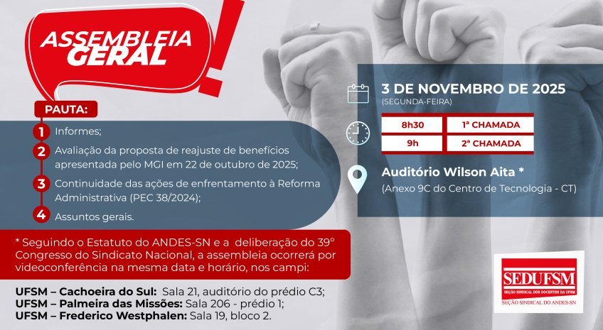 Na próxima segunda-feira, 3 de novembro, as e os docentes da UFSM reúnem-se em assembleia para avaliar as propostas apresentadas pelo governo federal na última reunião da Mesa Nacional de Negociação Permanente (MNNP). O encontro, promovido pela Sedufsm, inicia às 8h30 em primeira chamada, e às 9h em segunda chamada, no Auditório Wilson Aita (Anexo 9C do Centro de Tecnologia, campus sede de Camobi). Como já é usual, a assembleia ocorre, de forma simultânea, em todos os campi da instituição, sendo transmitida por videoconferência. Conheça os locais: