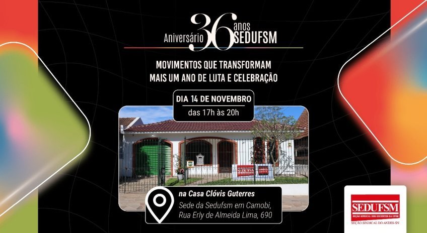 Nesta sexta-feira, 7 de novembro, a Sedufsm completa 36 anos de existência e, para marcar a data, será realizada uma celebração na próxima sexta, 14, na Casa Clóvis Guterres. Inicialmente a atividade estava prevista para hoje, contudo, teve de ser adiada em função das condições climáticas.