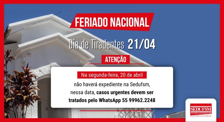 Na próxima segunda e terça-feira, dias 20 e 21 de abril, a Sedufsm não terá atendimento, em função do feriado estendido referente ao Dia de Tiradentes (21). As datas seguem calendário da UFSM, que considera o 20 de abril como dia não letivo, suspendendo, também, atividades administrativas correlatas. Casos urgentes serão atendidos, na segunda, pelo WhatsApp (55) 99962-2248.